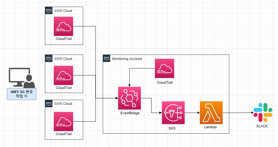 - 모든 Account에서 발생하는 SG변경 사항을 MonitoringAccount를 통해 알람이 전송되도록 구성